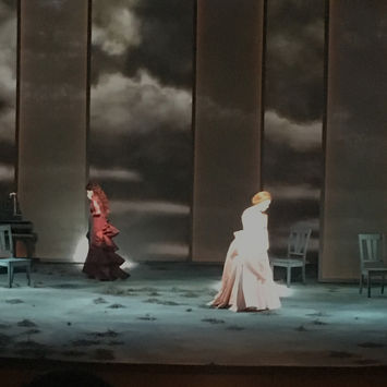 This was my first experience with translucent drops. We created the gray scale using no black to give the lighting designers a more responsive surface for subtle changes. This show included a translucent muslin drop and portrait, opaque borders, stained chameleon cloth, an opaque textured ground cloth, faux grass, and a cotton gauze cut drop. These materials were also treated with fire retardants as there was an open flame in the show.